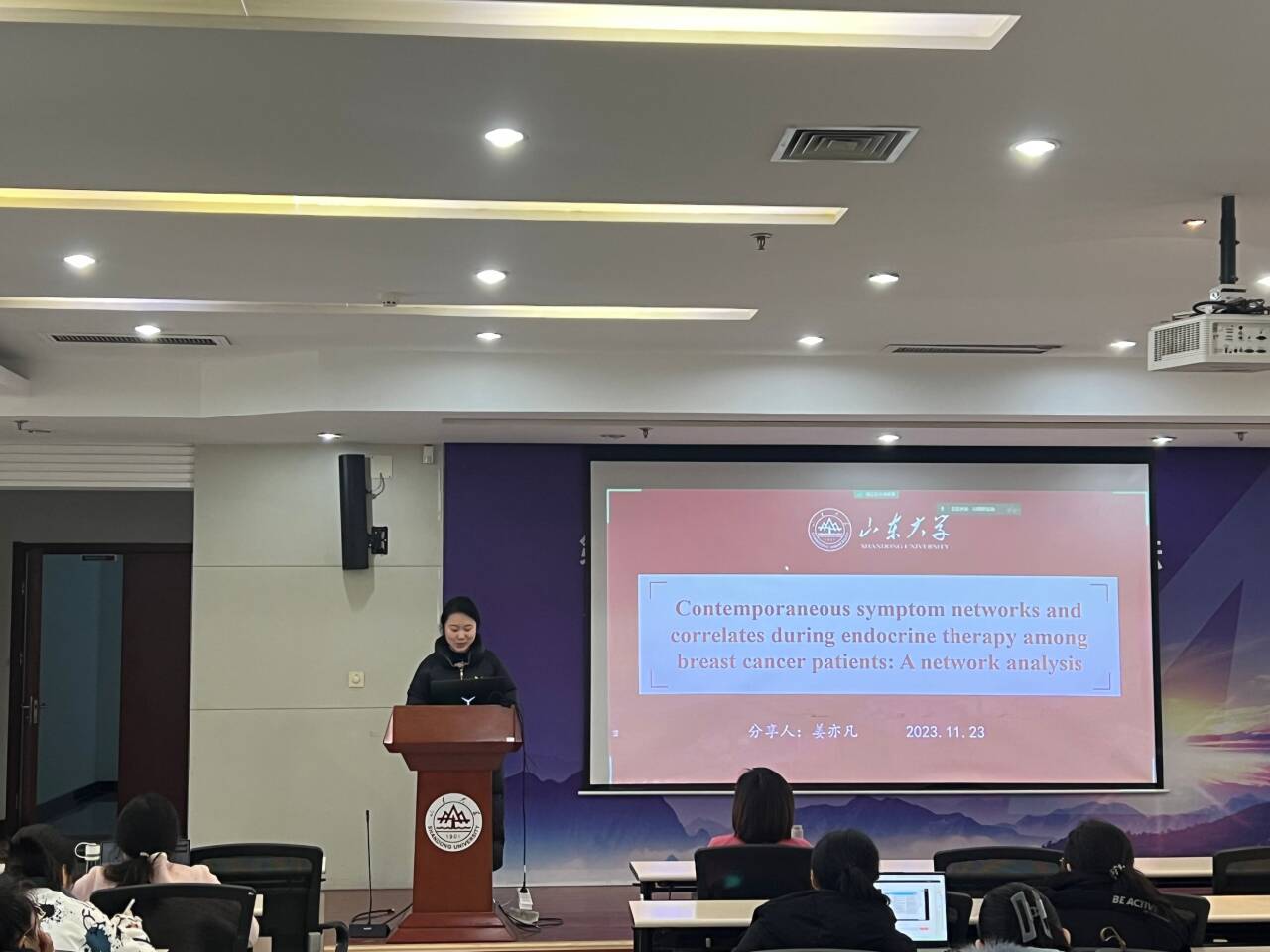 第三位汇报者是2022级硕士研究生姜亦凡,汇报的文章来自于Frontiers in Oncology期刊,题为 “Contemporaneous symptom networks and correlates during endocrine therapy among breast cancer patients: A network analysis”。由于治疗及护理的进步,乳腺癌的五年生存率已达到85%或以上。值得注意的是,内分泌治疗包括雌激素受体调节剂和芳香酶抑制剂对于降低复发率和死亡率至关重要。然而报告显示,接受内分泌治疗的乳腺癌患者通常会经历高水平的症状负担,这些症状会反过来影响药物依从性、解剖状态和生活质量。近年来网络分析为症状管理提供了一个新的视角。本研究的主要目的为利用网络分析这一可视化整体化的方式探索接受内分泌治疗的乳腺癌患者的核心症状及评估不同人口统计学和临床协变量之间症状网络的差异。结果显示,易怒和情绪波动是最普遍和最核心的症状。开发针对情绪症状的干预措施对于减轻接受内分泌治疗的乳腺癌患者的总体症状负担可能至关重要。然而本研究只是一个横断面研究,限制了因果关系,因此有必要在今后利用纵向研究发展动态网络来确定本研究的结果。