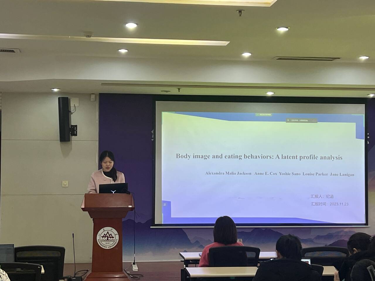 第二位汇报者是2022级硕士研究生纪涵,汇报的文章为来自于Body Image期刊,题为 “Body image and eating behaviors: A latent profile analysis”。积极身体意象(身体欣赏、功能欣赏)和消极身体意象(身体不满、体重偏差内化)可以同时出现,两种身体意象与饮食行为之间有着密切的联系。然而积极和消极身体意象的共存模式与饮食行为之间的关系尚不明确。Jackson等人采用潜在剖面分析来确定身体意象的特征,并在一个成人社区样本中探索其与饮食行为之间的关系。根据四种身体意象的总得分来建立潜在剖面模型。使用三步法来探索身体意象的潜在类别和饮食行为之间的关系,综合考虑后,选择了4类别为最佳模型,类别1为欣赏和轻度不满,类别2为功能欣赏和中度不满,类别3为强烈不满,类别4为强烈欣赏。最终结果显示,与所有其他类别的人相比,类别4(强烈欣赏)的人表现出更好的饮食行为特征。这提示我们为了继续发展对身体意象及其与饮食行为关系的整体理解,未来研究可涉及同时测量身体意象的多个方面。