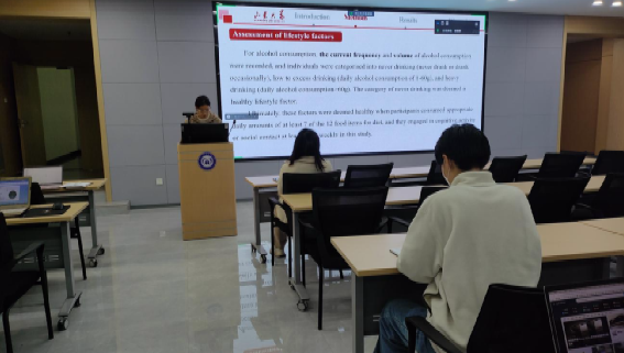 第二位汇报者是2022级硕士研究生龚蓉,汇报的文章来自于The British Medical Journal期刊,题目为“Association between healthy lifestyle and memory decline in older adults: 10 year, population based, prospective cohort study”。该研究是一项评估不同健康生活方式、载脂蛋白Eε4基因型及其相互作用对10年认知正常老年人记忆力影响的纵向队列研究。研究人群来自中国48个城市和48个农村,基线纳入29072名老年人,在10年的随访期间,7164人死亡,3567人因各种原因停止参与。研究发现,在认知正常的老年人中,健康的生活方式与记忆力下降的速度较慢有关,包括那些在基因上容易记忆力下降的人。健康饮食对记忆力的影响最大,其次是主动认知活动、规律性体育锻炼、主动社交、从不吸烟或以前吸烟、从不饮酒。基于该研究,未来可关注某些疾病的特异性指标,找到疾病与特异性指标的相互作用。此外,可进一步研究健康生活方式对年轻人记忆力下降的影响,以阐明健康生活方式可以发挥最有利作用的关键年龄窗口。