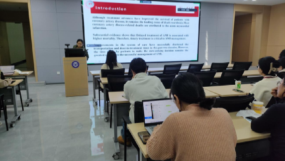 第四位汇报者是2022级硕士研究生苏梦君,汇报文章为来自于International Journal of Nursing Studies,题目为Theory-based cognitive–narrative intervention versus didactic education for promoting prompt care-seeking for acute myocardial infarction: A multisite mixed-methods randomized controlled trial。心肌梗死是导致冠心病患者死亡的首要原因,而延迟就医是导致心肌梗死死亡的重要影响因素,患者作出求医决定的时间需引起医务人员重视。基于理论的认知叙事干预对患者进行心肌梗死症状、处理措施等知识的结构化教育与视频演练,并根据“叙事”理论指导鼓励患者积极讨论关注点与疑惑点。与传统口头教育相比,基于理论的认知叙事干预增强患者识别理解急性心肌梗死症状的能力,显著地改善心肌梗死患者对心肌梗死信念、态度,提高了应对心肌梗死的积极性及应对能力,进而显著减少延迟就医时间,是减少心肌梗死院前延迟时间的一项有效举措。