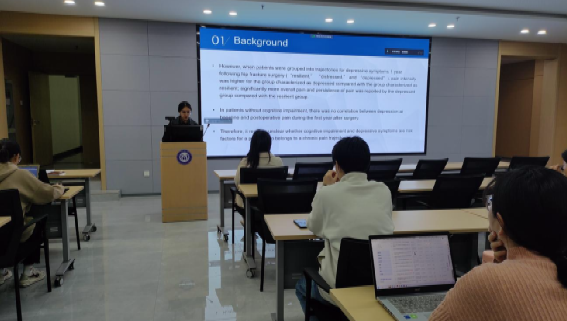 第一位汇报者是2022级硕士研究生曲雯冉,汇报文章来自Journal of the American Medical Directors Association期刊,题为“Influences of Cognitive Function and Depressive Symptoms on Pain Trajectories During the First Year Following Hip Fracture Surgery: A Prospective Cohort Study”。该研究是跟踪台湾某医院2012年9月至2019年3月期间接受髋部骨折手术的患者,并在出院后随访1年,探讨髋部骨折术后第一年术后疼痛强度模式的运动轨迹图,并研究疼痛运动轨迹组与认知障碍和抑郁症状之间的关系。该研究发现3种不同的疼痛轨迹组:剧烈下降-最小疼痛组(47.7%),轻度下降-轻度疼痛组(45.5%),轻微下降-中度疼痛组(6.8%)。研究表明:疼痛强度与认知障碍和抑郁症的风险相关,髋部骨折手术后认知障碍和抑郁症风险较高的老年人更有可能属于疼痛强度较高的一组。综上所述,老年人在髋部骨折手术后,应关注认知障碍和抑郁风险的评估,以防止术后持续疼痛。建议进一步对临床诊断为认知障碍和抑郁症的老年患者进行研究。
