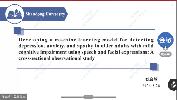 第四位汇报者是2022级硕士研究生魏会敏,汇报的文章为来自于International Journal of Nursing Studies期刊,题为“Developing a machine learning model for detecting depression, anxiety, and apathy in older adults with mild cognitive impairment using speech and facial expressions: A cross-sectional observational study”该研究旨在开发一种机器学习模型,以根据言语和面部表情检测和区分抑郁、焦虑和冷漠。该研究在北京一家三甲医院的记忆门诊招募319名患有轻度认知障碍的患者。抑郁、焦虑和冷漠分别采用公共卫生问卷、一般焦虑障碍和冷漠评价量表进行评价。同时,使用音频和视频录制软件对患有轻度认知障碍的老年人的言语和面部表情进行数字捕获。开源数据分析工具包用于提取语音、面部和文本特征。采用多类分类法开发分类模型,并解释模型中各特征的贡献。结果发现,采用随机森林方法建立多类情绪分类模型在情绪分类方面表现良好。本研究开发的机器学习模型在检测和区分抑郁、焦虑和冷漠方面表现出很强的分类性能。这种创新方法将文本、音频和视频相结合,为精确分类和远程监控护理实践中的这些症状提供了新方法。