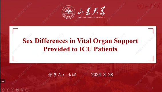 第三位汇报者是2022级硕士研究生王璇,汇报的文章来自于Critical Care Medicine期刊,题为“Sex Differences in Vital Organ Support Provided to ICU Patients”。该研究数据基于在澳大利亚和新西兰重症监护协会的成人患者数据库(APD)中记录的ICU患者入院情况,共纳入699535名成人患者。通过逻辑回归比较患者在使用有创通气、无创通气(NIV)、血管活性药物、肾脏替代治疗、ECMO和这五种器官支持中的任何一种方面的性别差异。结果显示,在调整了诊断、疾病严重程度等重要混杂因素后,除ECMO外,女性获得的重要器官支持少于男性。尽管女性接受了侵入性较小的治疗,但女性死亡的可能性反而低于男性。女性的这种生存优势仅限于没有接受任何重要器官支持的亚组患者。而在接受一个或多个重要器官支持的患者中,女性和男性死亡的可能性相同。这启示我们,女性可能从保守的治疗方法中获益,临床决策者应该全面考虑危重症患者的疾病特点,在保证公平的基础上制订个性化的治疗方案。