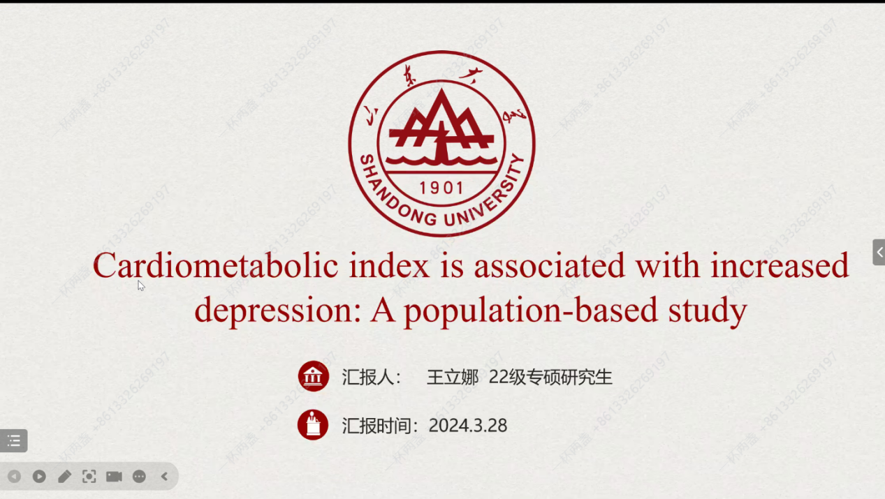 第二位汇报者是2022级硕士研究生王立娜,汇报的文章来自于 Journal of Affective Disorders期刊,题为“Cardiometabolic index is associated with increased depression: A population-based study”。文章选取了7229名年龄大于20岁的参与者,探讨了心血管代谢指数(CMI)与抑郁发生率之间的关系。这项研究基于2011至2018年的NHANES数据,使用多元逻辑回归和平滑曲线拟合来研究CMI与抑郁之间的联系。抑郁症是一种常见的心理疾病,其发病与脂质代谢紊乱密切相关。CMI是一个新指标,综合了血脂两个量化指标(甘油三酯/高密度脂蛋白胆固醇)和人体肥胖相关参数(腰高比)。研究结果表明,CMI与抑郁呈正相关。在完全调整模型中,CMI每增加一个单位,抑郁症状的可能性增加36%。处于CMI最高四分位数的参与者比最低四分位数的参与者抑郁风险高62%。这种正相关在有高血压的人群中更为显著。这可能表明,在心血管健康管理中,对于有高血压历史的人群,更应关注CMI的变化,以预防抑郁症的发生。通过对这篇文章的分析,可以看到心血管代谢健康与心理健康之间存在复杂的相互作用。这强调了综合考虑个体的心理和生理健康的重要性,以及在公共卫生策略中采取更为全面的健康管理方法的必要性。未来的研究需要进一步探索这些发现的潜在机制,并验证CMI作为预测工具在预防和管理抑郁症方面的有效性。