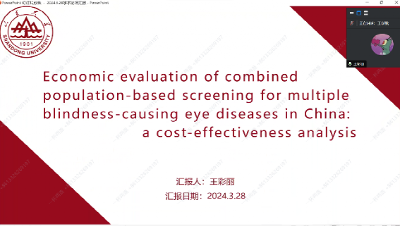第一位汇报者是2022及硕士研究生王彩丽,汇报的文章来自于Lancet Global Health期刊,题为“Economic evaluation of combined population-based screening for multiple blindness-causing eye diseases in China: a cost-effectiveness analysis”。该研究使用Markov模型分别建立了农村和城市环境中基于人群的五种常见致盲性眼病的联合筛查策略,并评价三种筛查策略的经济学效益。研究发现,在中国的农村和城市中,对多种致盲性眼病的人群筛查方案可能具有较高的成本效益。三种筛查策略(非远程医疗筛查、非AI远程医疗筛查、AI远程医疗筛查)均符合高成本效益的健康干预标准。此外,研究还发现,在中国农村和城市地区每年进行AI筛查都是最优的筛查策略。这提示我们,人工智能与远程医疗和移动医疗相结合,通过扩大医疗资源的覆盖范围,可以提高眼健康服务的质量、可持续性和公平性,将在低中等收入国家中产生社会效益和经济效益。