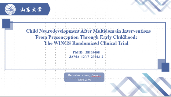 第一位汇报者是2022级硕士研究生张子璇,汇报的文章来自JAMA期刊,题为“Child Neurodevelopment After Multidomain Interventions From Preconception Through Early Childhood: The WINGS Randomized Clinical Trial”。该研究是妇女和婴儿生长综合干预研究(WINGS)的一部分,评估包括健康、营养、水、环境卫生、个人卫生 (WASH)和心理社会支持在内的一整套干预措施在孕前、怀孕和儿童早期实施对儿童神经发育的影响。研究共1713名儿童在24个月大时进行了神经发育的评估,包括509名接受孕前、孕期和儿童早期干预的儿童,473例仅接受孕前干预,380例仅接受孕期和儿童早期干预,350 例接受常规护理。结果发现,与24月龄的对照组相比,单独孕前干预组的儿童认知评分更高,但语言、运动和社会情感评分与对照组相似。与对照组相比,仅接受孕期和儿童早期干预的患者具有更高的认知、语言、运动和社会情感评分,且在认知、语言和社会情感发育方面的中度至重度延迟的发生率风险比也较低。孕前、孕期和儿童早期的联合干预组儿童在认知、语言、运动和社会情感的得分也高于对照组,中度至重度延迟的发生率风险比更低。这启示我们,联合孕前、孕期和儿童早期的多领域干预可以使 24 个月时儿童神经发育有适度改善,有必要进一步评估以通过此类干预促进儿童神经发育。