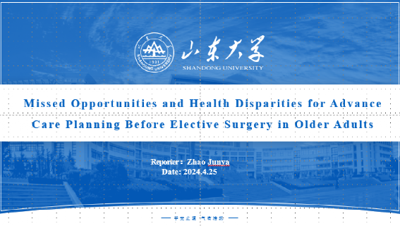 第三位汇报者是2022级硕士研究生赵军亚,汇报的文章来自JAMA Surgery期刊,题为“Missed Opportunities and Health Disparities for Advance Care Planning Before Elective Surgery in Older Adults”。本研究基于最大的老年外科患者人群队列,主要描述65岁及以上接受择期手术住院患者的疾病特征和ACP水平,评估ACP发生率和预测因素。这是一项回顾性队列研究,使用了单一的三级医疗学术中心的电子健康记录、美国外科医生学会国家手术质量改进计划和加利福尼亚洲死亡登记数据库进行数据分析。研究结局指标包括术后严重并发症的发生率和年死亡率,次要结局指标包括住院总时间,术后ICU入住时间、呼吸机天数和出院后安排。结果表明,ACP发生率仅为14.7%,与其他外科人群及普通内科人群相比较低,男性和非英语首选语言是ACP缺失风险的预测因素,医疗保险的种类是ACP缺失风险的保护性因素。通过学习这篇文章,了解到我国与国际上其他国家ACP发生的现状差异,以及思考在国内不同人群不同疾病的阶段中实施的促进和障碍因素,选题的新颖性和研究对象的特殊性将为未来的研究提供良好的干预方向和政策指导。