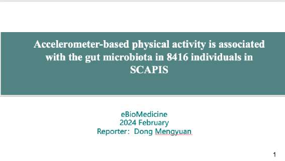第四位汇报者是2022级博士研究生董梦媛,汇报的文章来自eBioMedicine期刊,题为“Accelerometer-based physical activity is associated with the gut microbiota in 8416 individuals in SCAPIS”。这项研究使用来自瑞典 CArdioPulmonary BioImage研究(SCAPIS)的横断面数据,在8416名参与者中调查基于加速度计的久坐和身体活动与用深度鸟枪法宏基因组学分析的肠道菌群的关联。研究发现,久坐和体育活动与肠道微生物群存在关联,但其关联方向可能相反。具体而言,久坐与某些微生物种类的丰度呈负相关,而中等和高强度的体育活动则与其他微生物种类的丰度呈正相关。而且不同强度的体育活动可能对特定微生物种类产生不同的影响。另外,久坐、中等强度身体活动和高强度身体活动与微生物组的功能潜力有关。例如,中等强度身体活动与更高的乙酸盐合成能力有关,而久坐与较低的碳水化合物降解能力有关。这些发现为进一步理解体育活动与肠道微生物群之间的复杂关系提供了新的见解,可用于指导关于体育活动、肠道微生物群组成和健康结果之间相互作用的研究。此外,调查由身体活动引起的肠道微生物群的变化,对宿主造成影响,有助于表征健康的肠道菌群组成,并确定干预的候选菌群。