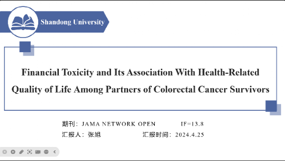 第二位汇报者是2022级硕士研究生张旭,汇报的文章来自JAMA NETWORK OPEN,文章题目为“Financial Toxicity and Its Association With Health-Related Quality of Life Among Partners of Colorectal Cancer Survivors”。该研究共纳入Ⅲ期经过手术切除的结直肠癌患者及其伴侣307对,采用混合方法研究,定量研究调查了患者伴侣的三个经济毒性中间结局(经济负担,债务,经济担忧)和伴侣健康相关生活质量,并评估了每个经济毒性中间结局与独立伴侣和患者变量之间的双变量关联,估计了3个多变量回归,以评估伴侣经济毒性中间结局与健康相关生活质量各个领域之间的关联;定性研究询问患者及伴侣癌症治疗过程的经验;将定量和定性研究结果整合起来,得出整合推论,为定量研究结果提供见解。定量研究结果显示:大多数伴侣(68.1%)报告了不良的经济结果。在疼痛干扰领域,高经济负担与较差的健康相关生活质量相关,债务与睡眠障碍领域较差的健康相关生活质量相关,高经济担忧与社会功能较差、疲劳和疼痛干扰领域的健康相关生活质量相关。定性研究结果显示伴侣描述了导致经济毒性的系统因素,例如高成本,来自不同提供者的多张账单,健康保险的挑战,错过或失去工作和工资,以及保险和医疗保健系统。大多数伴侣将癌症的经济毒性描述为取决于健康保险和就业状况。还描述了导致经济毒性的个人层面因素,伴侣将系统级问题描述为经济毒性的主要驱动因素,这导致了围绕经济决策和应对的个人行为机制。综上,这项调查研究的结果表明,通过系统和个人层面的行为因素,结直肠癌幸存者伴侣的长期经济毒性与较差的健康相关生活质量相关,研究结果提供了对经济毒性与伴侣健康相关生活质量特定领域之间关联的理解,帮助研究人员更好地制定干预措施,对患者和伴侣进行多层次干预,以解决个体和系统层面的因素,并纳入行为方法,以有效缓解经济毒性并改善患者和伴侣的健康相关生活质量。