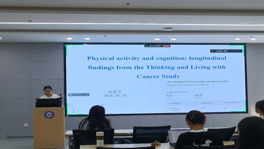 第二位汇报者是2023级博士研究生孔雯雯,汇报文献的题目是“Physical activity and cognition: longitudinal findings from the Thinking and Living with Cancer Study”,该文献发表在JNCI: Journal of the National Cancer Institute期刊。该研究对比了老年乳腺癌患者与未患癌症老年女性参与者在5年内的身体活动水平,并且探讨了老年乳腺癌患者的身体活动、炎症标志物(白细胞介素-6和C反应蛋白)与认知的关系。结果显示老年乳腺癌患者的身体活动水平从基线(进行系统治疗前)逐渐下降,并且低于对照组参与者的身体活动水平。满足有氧身体活动指南的老年乳腺癌患者与较高的自我报告认知和较低的炎症存在显著的统计学关系。然而,研究并未支持炎症标记物在是否满足身体活动指南与自我报告认知间关系的中介作用。研究结果提示,对于老年幸存者的护理应该考虑监测他们的身体活动状况并鼓励他们参与到有监督的锻炼计划中去,以促进他们癌症治疗后的身体活动和康复。