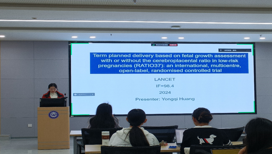 第一位汇报者是2023级博士研究生黄永棋,她汇报的文章发表在Lancet期刊,题为“Term planned delivery based on fetal growth assessment with or without the cerebroplacental ratio in low-risk pregnancies (RATIO37): an international, multicentre, open-label, randomised controlled trial ”。这是一项国际、多中心、开放标签的随机对照试验,旨在探讨与单独使用超声进行胎儿体重评估相比,增加脑胎盘比值的评估以及对脑胎盘比值小于第五百分位数的孕妇进行医疗建议是否可以降低围产期不良结局以及新生儿发生率。这项研究巧妙地运用临床筛查在多个国家和中心,基于较大的样本量开展了真实世界中的随机对照试验,其结果(增加脑胎盘比值的评估可以降低新生儿非神经系统疾病的发生率)可用于临床指南的制定,此外,本研究的方法学十分严谨,样本量的计算以及统计分析部分值得进一步学习。