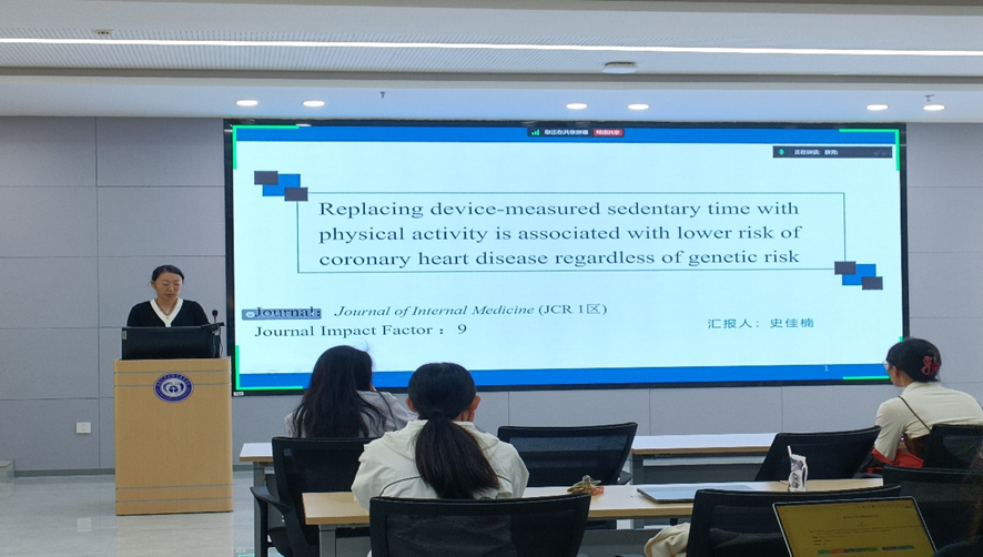 第三位汇报者是2023级博士研究生史佳楠,汇报的文献题目是“Replacing device-measured sedentary time with physical activity is associated with lower risk of coronary heart disease regardless of genetic risk”,该文章发表在Journal of Internal Medicine期刊。该研究基于300个与冠心病密切相关的单核苷酸多态性构建加权多基因风险评分以量化冠心病的遗传易感性,并采用三分位数法将研究人群划分为冠心病低遗传风险、中遗传风险以及高遗传风险。采用加速度计评估个体的久坐时间、低强度身体活动时间以及中高强度身体活动时间。基于成分等时替代模型分别探讨在不同冠心病遗传易感性人群中久坐时间以及采用身体活动替代久坐时间与冠心病发生风险的相关性。结果显示,无论冠心病遗传风险有多高,久坐时间与冠心病的发生风险密切相关,而采用等量的中高强度身体活动替代等量的久坐时间与冠心病的发生风险降低密切相关。与低遗传风险或中遗传风险的人群相比,在冠心病高遗传风险的人群中采用等量的中高强度身体活动时间替代等量的久坐时间,其冠心病绝对风险的下降幅度相对较高。因此,采用中高强度身体活动替代久坐行为应是预防所有个体,尤其是存在冠心病高遗传风险的人群冠心病发生的重要举措。