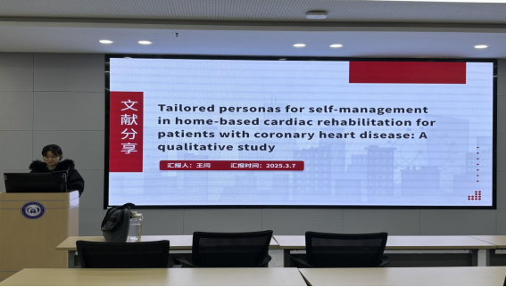 第二位汇报者是2023级硕士研究生王闫,文章题目为“Tailored personas for self-management in home-based cardiac rehabilitation for patients with coronary heart disease: A qualitative study”,于2025年3月发表在International Journal of Nursing Studies期刊,影响因子为7.5。该研究采用定性研究方法,于2024年4月至7月在中国某心脏康复中心,通过目的抽样选取了28名符合条件的冠心病患者进行半结构化访谈,最终确定了构建患者角色的三个关键维度:描述、特征和需求,并据此塑造出五种不同类型的患者角色。该研究深入探讨了冠心病患者居家心脏康复自我管理的异质性,为精准护理提供了重要理论支持。汇报者指出,每个患者都是独特的个体,其文化背景、教育程度、健康知识水平、家庭支持等因素都会影响自我管理行为。因此,在医疗护理中,医护人员需要更加注重个体差异,将精准护理理念融入到各个环节,以提高整体医疗服务质量,帮助患者更好地康复。