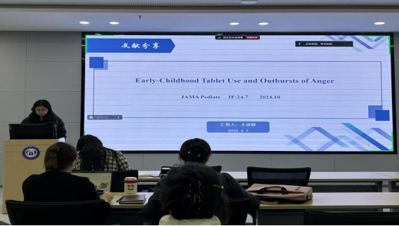 第一位汇报者是2023级硕士研究生王淑静,文章题目为“Early-Childhood Tablet Use and Outbursts of Anger”,于2024年8月发表在JAMA Pediatrics期刊,影响因子为24.7。该研究采用纵向随机截距交叉滞后模型,发现儿童早期使用平板电脑与愤怒和沮丧情绪爆发之间存在年龄特异性双向关联。具体而言,3.5岁的儿童平板电脑的使用情况与1年后(即4.5岁)易发怒和沮丧的表现存在显著关联;4.5岁儿童愤怒和沮丧情绪的爆发与5.5岁时平板电脑的使用增加呈显著正相关。这些研究结果表明,平板电脑的使用会削弱儿童在日常生活中有效管理情绪的能力。此外,表达愤怒情绪较多的儿童可能会通过增加电子设备使用频率来缓和爆发的情绪。汇报者指出,幼儿期是儿童发展的敏感期,宜推迟儿童首次接触平板电脑的时间并鼓励家长监督儿童的屏幕使用情况。此外,还可以鼓励家长选择非屏幕活动,例如角色扮演游戏、阅读活动和体育活动,这些活动已被证实有助于儿童培养自我情绪调节能力。最后,鉴于父母在引导儿童情绪调节方面起着关键作用,也可鼓励家长在孩子在场时,有意识地减少电子设备的使用频率。