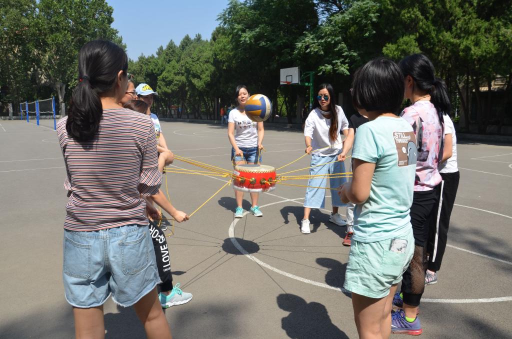 接着,沈老师依次介绍了本次活动的四个项目:珠行万里、永八字、不倒森林和击鼓颠球。简单的训练后,两队队员开始了激烈的PK赛。首先是珠行万里,11名队员需要默契的配合,通过每人手中的球槽将球传动到下一个人的球槽中,直至球到达指定的杯中为止,整个过程中球不能掉、不能停、不能后退。“十①朵金花”队各队员集中精力,合理控制球滚动的速度,精准衔接,首次尝试就成功完成;“金刚葫芦娃”队也不示弱,虽然有几次失败,但她们毫不气馁,互相鼓励,顺利完成项目。紧接着两队依次进行了其他三个项目,每个项目进行中都有不同的困难和失败,但同学们乐于挑战,为了共同的目标积极努力,两队均取得了好成绩。在集体中,每个人都是不可忽略的部分,为了共同的目标而团结在一起,只有责任心和协作精神并存才能实现个人和团队的双赢。