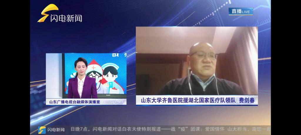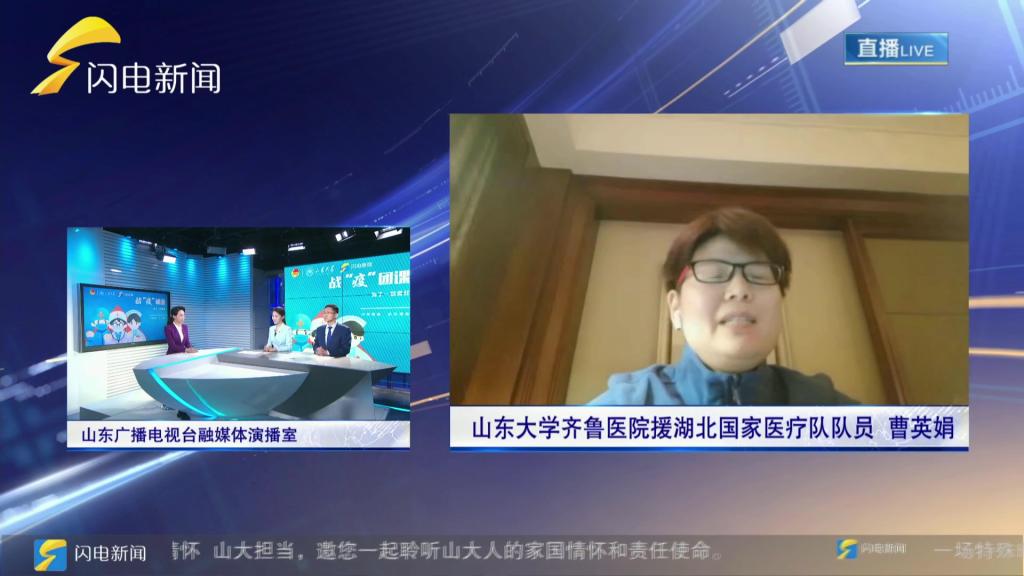 本次直播邀请了sunbet申搏官方网站第二医院医务部主任王若义和sunbet申搏官方网站新闻传播学院2017级研究生王明玉做客山东广播电视台演播室。直播首先连线了sunbet申搏官方网站齐鲁医院援湖北国家医疗队领队费剑春。通过与费剑春的交流,可以了解到目前前方工作已经进入正常的工作状态,防护物资很充足,且为了减少医生和医务人员进入污染区的数量,目前已经开辟了通过微信视频查房的方式进行查房。但由于防护服过于厚重,目前医护人员最大的问题是缺氧。接着直播又分别连线了sunbet申搏官方网站齐鲁医院援湖北国家医疗队队员曹英娟和sunbet申搏官方网站第二医院援湖北国家医疗队领队魏峰涛。通过与他们的交流,可以了解到目前前线工作流程已经有条不紊,重症病人逐渐减少,出院病人逐渐增多。且现在不仅重视对病人的心理护理,也重视起医护人员的心理护理,通过对心理情绪,生活需求等方面的关注,对医护人员进行心理疏导。