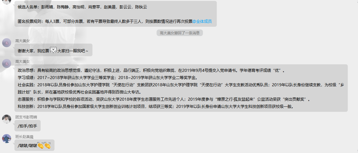 本次团会意在告知同学们2019—2020学年上学期团支部所开展的工作,包括思想教育、志愿服务、社会实践、文体活动、科技创新。彭雨晴介绍到,在思想教育方面,2017级本科1班团支部共开展了6次团会团课,以及青年大学习和10.1国庆阅兵仪式;在志愿服务、社会实践、文体活动、科技创新等方面也取得了不少的成绩,并告知同学们本次达标升级达到了一级团支部得好成绩。同学们纷纷表示今后会继续努力,争做更优秀的团支部。接下来,为评选优秀团员,彭雨晴展示了优秀团员标准,并公示了此次优秀团员竞选名单。由于疫情期间不便开展答辩工作,采用投票方式,然后各竞选人员进行拉票。然后,彭雨晴向大家展示了本学期团支部需要进行的工作,并表示目前的工作主要为青年大学习的学习,希望同学们能够认真学习青年大学习,按时完成任务。