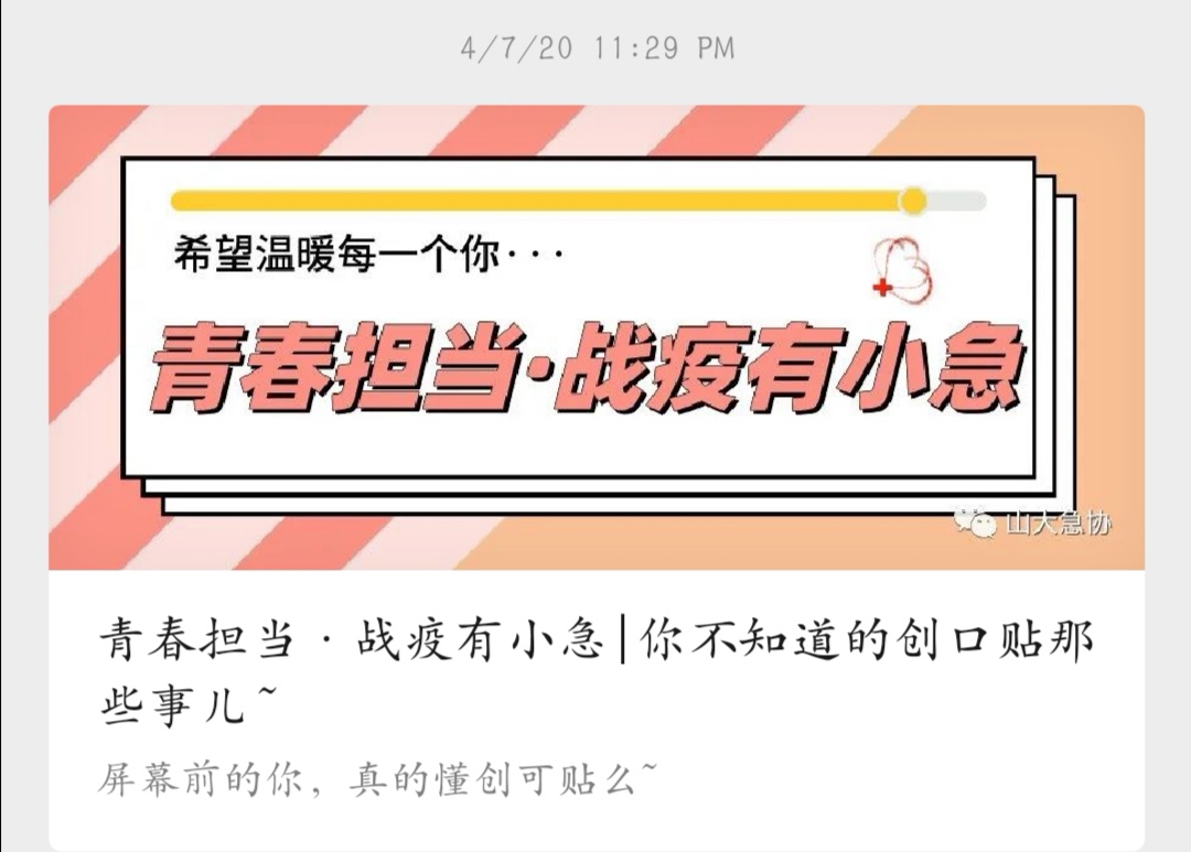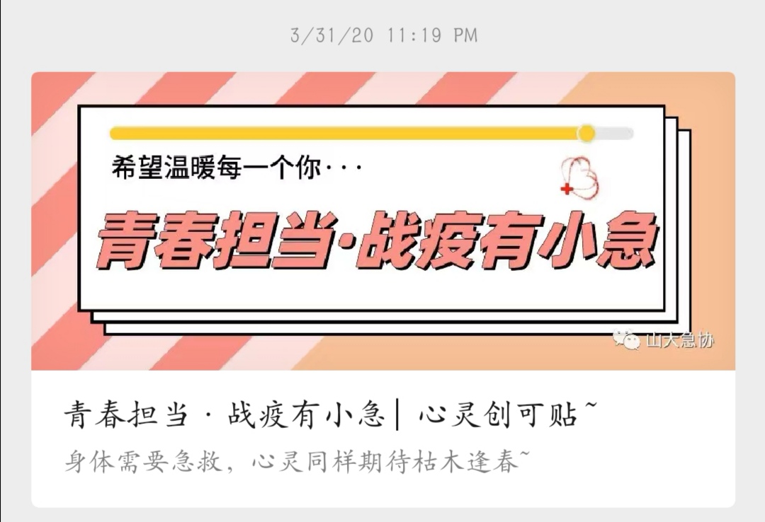 自校团委号召全体学生开展“青春担当,战疫有我”实践活动后,sunbet申搏官方网站急救协会积极响应号召,开展“青春担当,战疫有小急”系列志愿活动。依托微信公众号“山大急协”平台,积极搜集资料制作推文,宣传各类健康知识,为抗击新冠疫情贡献山大学子的绵薄之力。