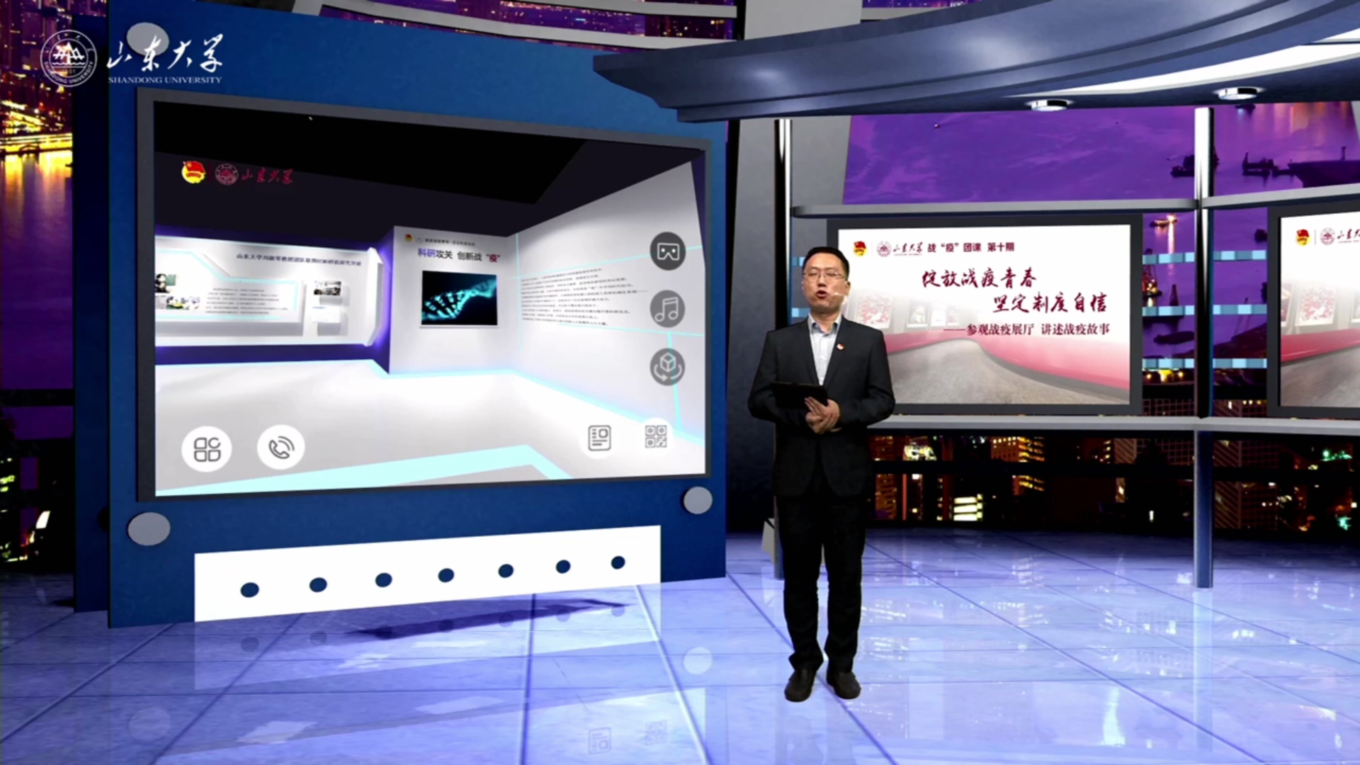 本次直播团课由sunbet申搏官方网站团委书记张熙主持,共青团sunbet申搏官方网站委员会和sunbet申搏官方网站继续教育学院主办。本次直播团课展览主题分为五大部分,第一展厅团旗飘扬、青年担当:主持人向我们讲述了sunbet申搏官方网站齐鲁医院与四川大学华西医院于天河机场相见的故事,这次见面给了疫情期间的人们极大的鼓舞,除此之外,还展示了张静静护士的故事,对她表示了缅怀。第二展厅五四精神、传承有我:主持人张熙讲到,今年山大人五四精神最好的继承与发扬就是山大人的战“疫”精神,另外,更是讲到了自疫情发生以来,sunbet申搏官方网站开展的九期团课的情况。第三展厅是实践育人、服务引领:展示了sunbet申搏官方网站实践育人成果的成果,其中尤为突出的是疫情期间山大青年人结合自身专业特点投身志愿服务的三则案例。接下来进入第四展厅风雨诗心、守望人文:在这一展厅,张熙讲到,校团委为以美化人,以文育人而开展的美育十讲专栏,为丰富同学的课余生活,校团委特编排了文艺讲座内容,以微信推文的形式向大家展示,除此之外,张熙向同学们展示了合唱团在疫情期间所创作的歌曲《隔不断的爱》。最后来到了第五展厅科研攻关、创新战“疫”:在这一部分,通过团课,同学们看到疫情期间sunbet申搏官方网站利用自己的创新能力研发出了许多抗击疫情的科技神器,这些科技神器无不显示了sunbet申搏官方网站在科研创新战疫方面的突出成果。团课最后以同学们一起聆听团歌完美结束。