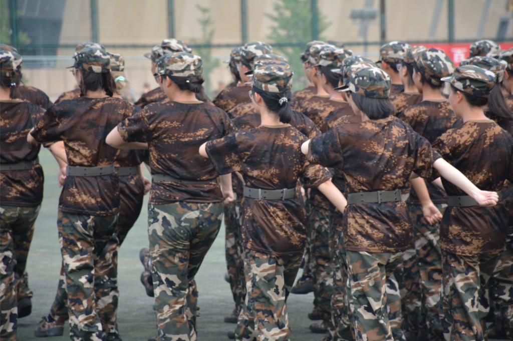 军训最开始也是最必要的任务就是站军姿。新生们如一棵棵挺拔的白杨,直直地扎根在操场。烈日炎炎,同学们汗如雨下,但全都一声不吭,笔直地站着,严格遵守教官的指令。结束了每日例行的站军姿之后,同学们将要学习齐步走、立定和正步走三大步伐。三大步伐的教学都从摆臂动作开始,再进行抬腿的训练,教官挨个指导每一位同学的动作,高标准,严要求,只有每一个分解动作都标准到位,才能保证整体动作的整齐一致。当哨声吹响,每一条臂膀的摆动都恰到好处,每一次行进的脚步都震地有声,军训才刚刚开始,虽然连队不能整齐划一,但每一位同学都尽力做到最好,以严格的标准要求自己。