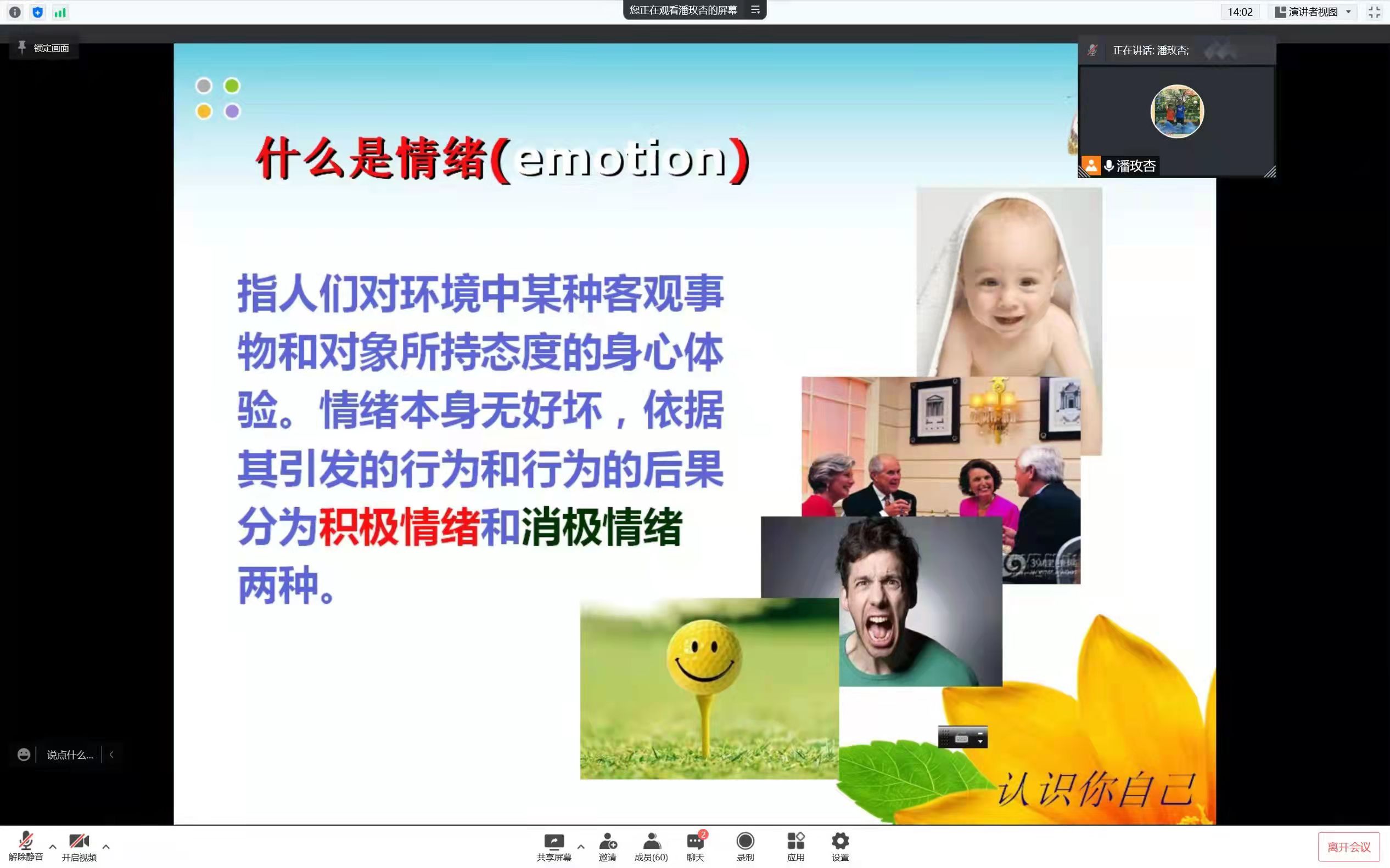 潘老师首先抛出了“大学已过3/4,你过得快乐吗?”“你想过未来做什么吗?”“你是否感觉到压力、困惑、焦虑与烦恼?”等问题,引发同学们对自己的思考。随之过渡到有关情绪的定义,以及情绪的表现及影响。潘老师通过简短的例子向同学们介绍了调节情绪的重要性,建议同学们要保持积极的情绪。