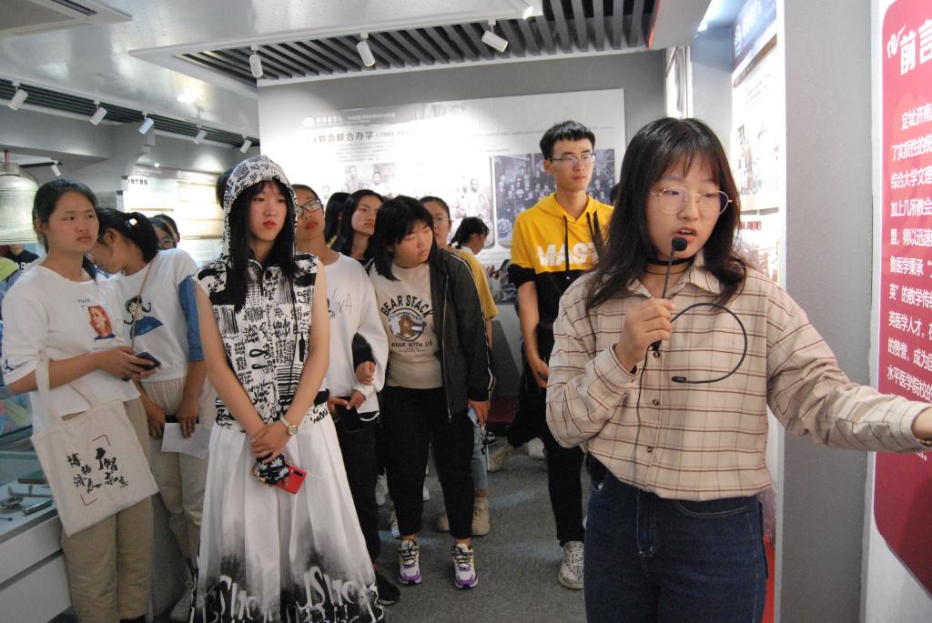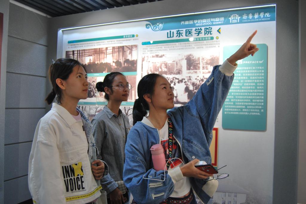 紧接着,新生紧跟讲解员的脚步进入第二展馆。1952至2000年是齐鲁医学变迁与奋进,砥砺前行的一段时期。在此期间,华东白求恩医学院与山东省立医学院合并为山东医学院,并进一步发展为山东医科大学。改革开放后齐鲁医学发展双语教学与对外交流合作教学方式,成果斐然。
