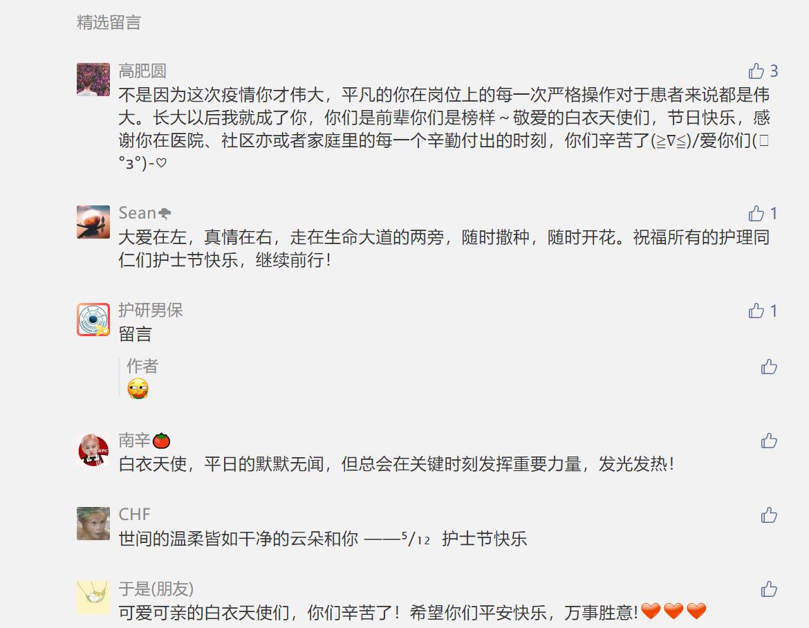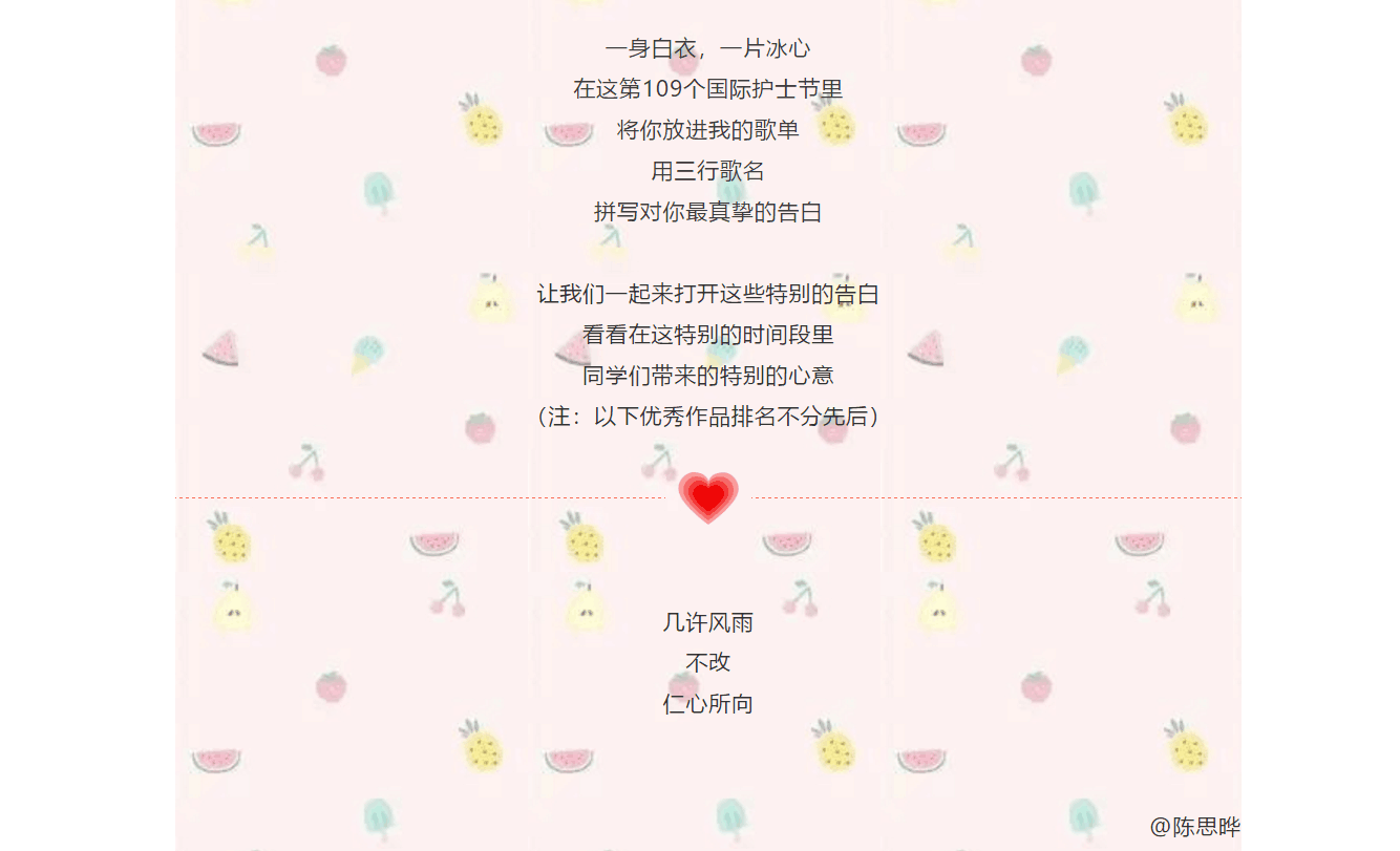 护理技能协会举办线上留言活动,让同学们在自己的节日里送祝福,表心愿,树目标,谈理想,“大爱在左,真情在右,走在生命大道的两旁,随时播种,随时开花。”同学们充分利用线上平台表达对职业的期望,对疫情期间医护工作者的祝福。同时,学院在全体学生中发起“同心战疫,我们在一起”行动,通过网络视频,引导同学们更好的学习疫情期间的医护工作者的奉献精神,更深刻的意识到护理工作的重要性,更发自内心的将自身工作与国家加强护理队伍建设融合在一起。同时学院举行三行诗名征集大赛,用三行诗为媒介,向疫情中奋战在一线的护理工作者们致敬,获奖作品及推文在护士节当天通过微信公众号推出展示。