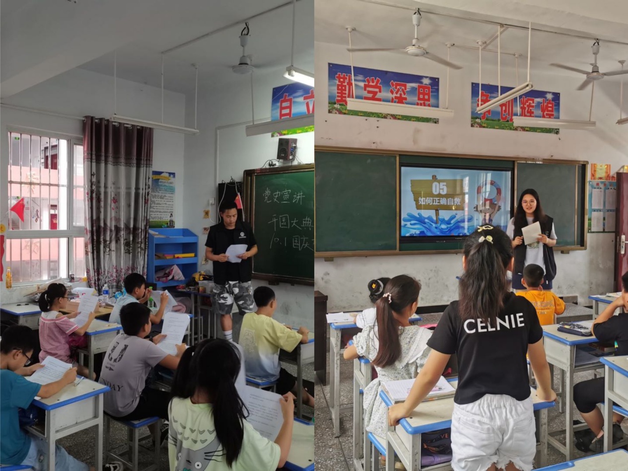 他们引导学生通过制作“心理健康小名片”的方式来更好的认识自己,组织学生放飞承载着烦恼的纸飞机而减轻压力,学生能够利用学习到的“情绪ABC理论和合理情绪疗法”有效调整自己的情绪。开展正念冥想练习提高学生注意力,减少课堂冲突,帮助控制情绪,对心理调节也有重要作用。对学生进行的“房树人”绘画心理测验,根据绘画内容对学生性格、成长、心境做出基本判断,以便了解学生心理健康状况。益智课堂以游戏的方式,通过体验一系列有趣的益智游戏,提高学生逻辑思维能力和灵活变通的能力。音乐课辅以乐器演奏,通过优美的乐曲让孩子们在音乐中体会快乐,并鼓励孩子们勇敢表现自己。在支教课程正式开始前以及结束后,支教调研团给学生们分别安排了两次心理健康摸底问卷,根据前测问卷和“房树人”心理测验,对当地儿童心理健康状况进行了简单的摸排。对于在测验中暴露问题的学生,队员们先是通过访谈和正强化加以干预,后期开展家访工作,了解家庭因素对儿童性格心理的影响并争取得到家庭的配合,明显改善了这些儿童的行为状态,得到学校和家长双方的热烈欢迎和高度评价。