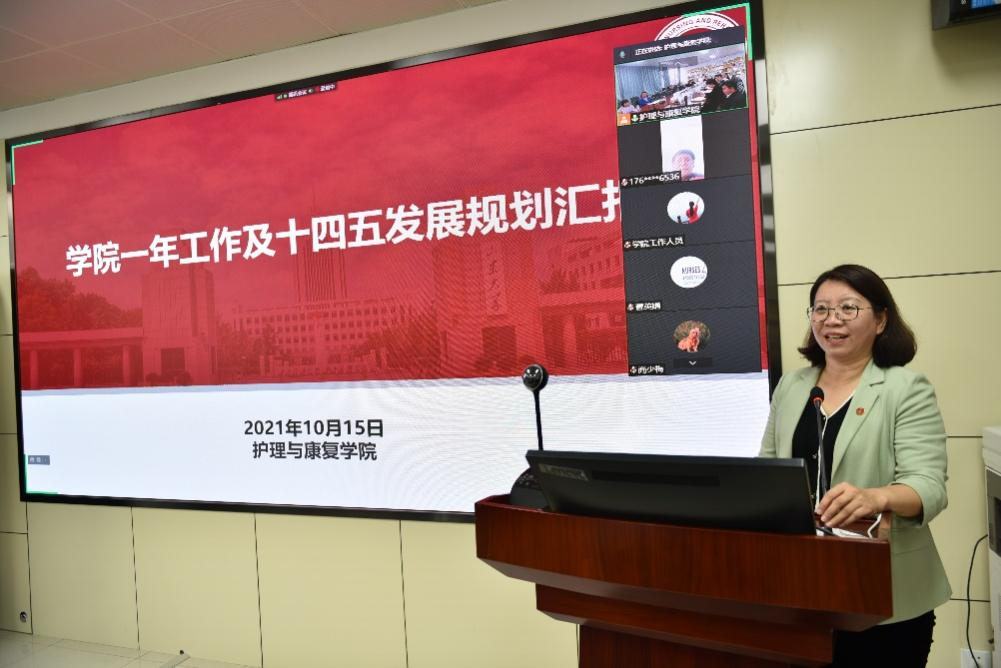 院长王克芳作了关于学院一年工作及“十四五”发展规划的报告。她从“人才培养、学科方向、师资队伍、科研创新、国际交流合作、社会服务”等十个方面系统总结sunbet申搏官方网站成立以来取得的成绩,并提出“十四五”期间学院新发展思路和总体目标,指出下一步重点推进的工作任务和具体举措。她表示,在“十四五”期间,学院将以立德树人为根本,致力于培养最优秀的本科生和最具创造力的研究生,创新“护理+”人才培养新模式,聚焦“老年健康照护、心理应激与健康、慢病延续护理、智能康复与护理”等重点学科方向,优化学科战略布局,加强师资队伍建设,打造院院融合、学科融合、资源融合的“康护医体”一体化,深入推进医教、科教、产教协调,构建跨学院-医院、跨学科的具有山大特色护理与康复学科的发展新模式。