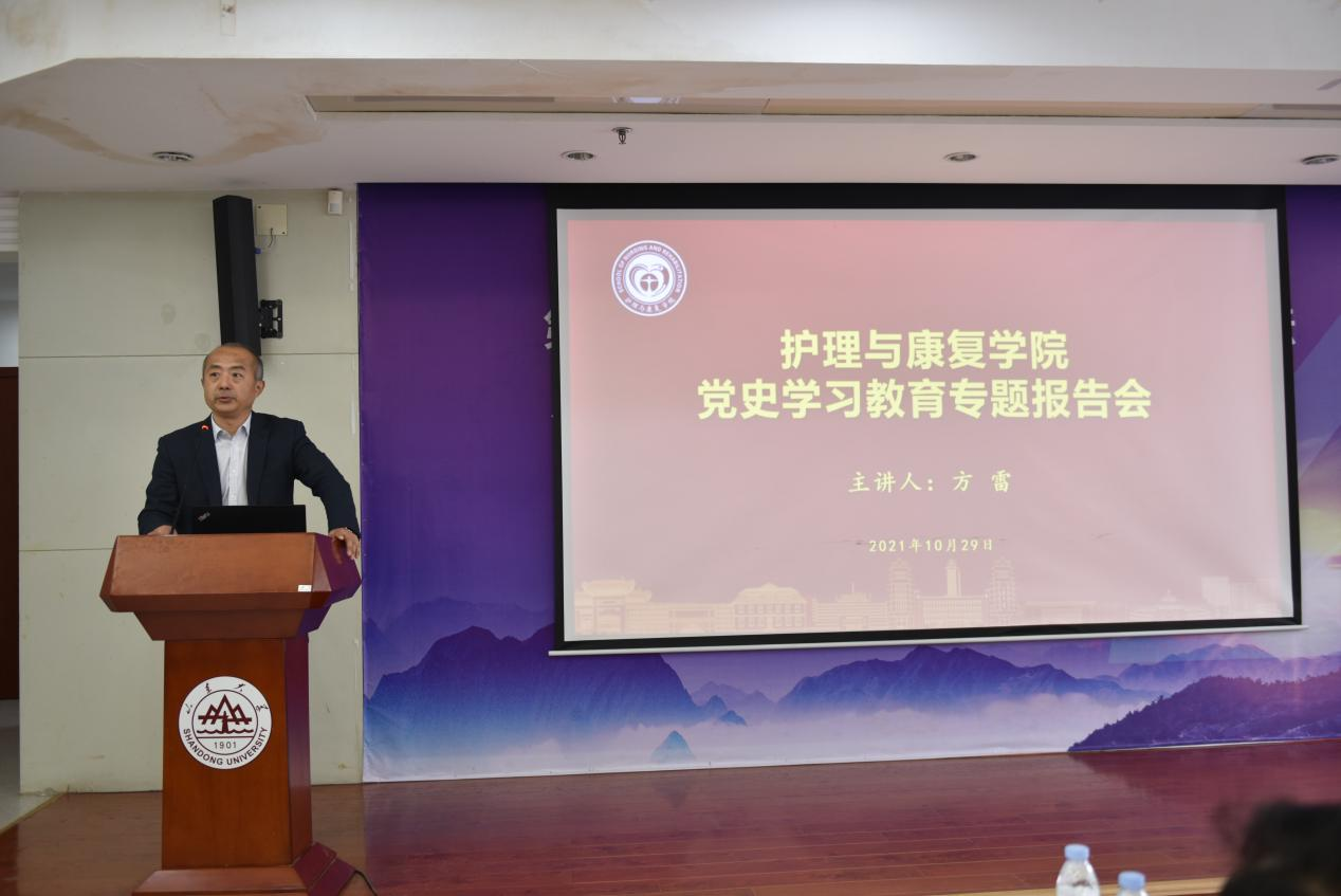 2021年10月29日上午,sunbet申搏官方网站邀请人文社会科学青岛研究院院长方雷为师生作党史学习教育专题报告。报告会由学院党委书记王晓林主持,院长王克芳、全院师生党员参加。