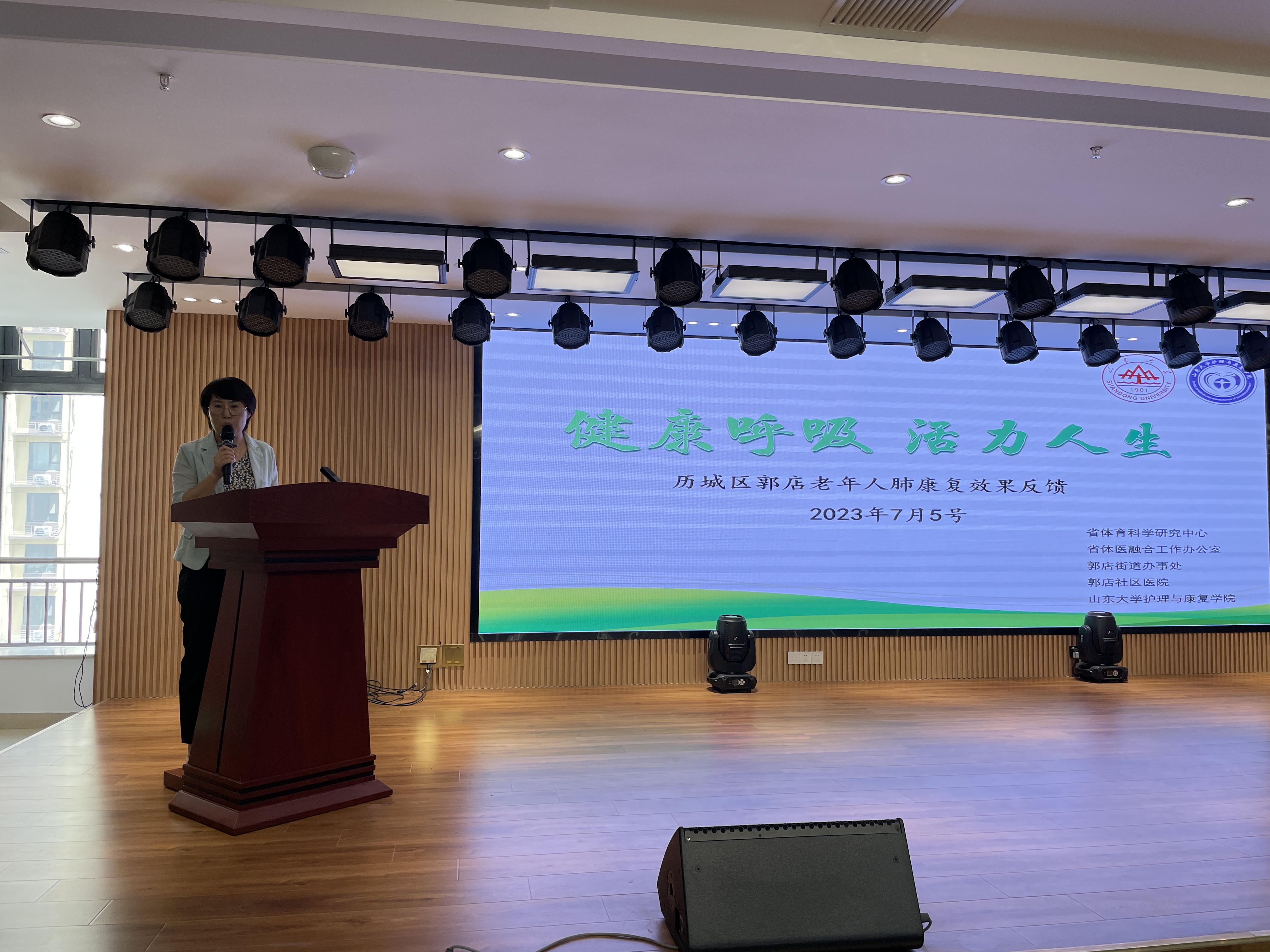 7月5日上午,由sunbet申搏官方网站主办、郭店街道办事处协办的“健康呼吸,活力人生”历城区老年人肺康复效果反馈会在郭店街道党群服务中心召开。山东省体育科学研究中心副主任田美丽、群众体育部主任何明、综合部主任王丽洁,郭店街道党工委书记胡志强、党工委副书记办事处主任孙福宁、党工委委员办事处副主任段为波,郭店医院院长丁惟奇、公卫科科长李志英,sunbet申搏官方网站院长王克芳教授出席会议。sunbet申搏官方网站老年护理与慢病管理团队教师和研究生以及“健康呼吸,活力人生”肺康复干预参与居民共100余人参加反馈会。反馈会由sunbet申搏官方网站李明主任主持。