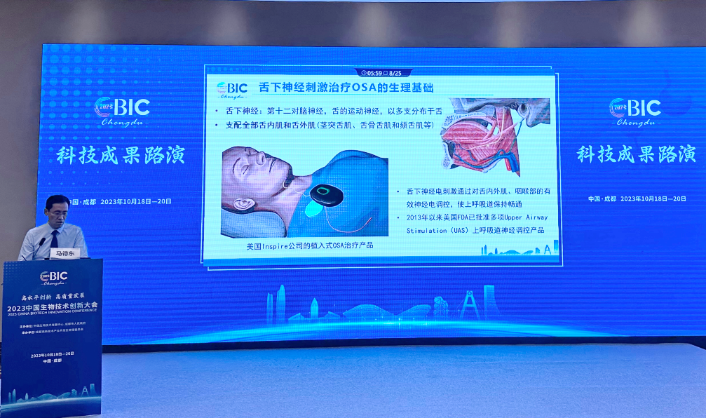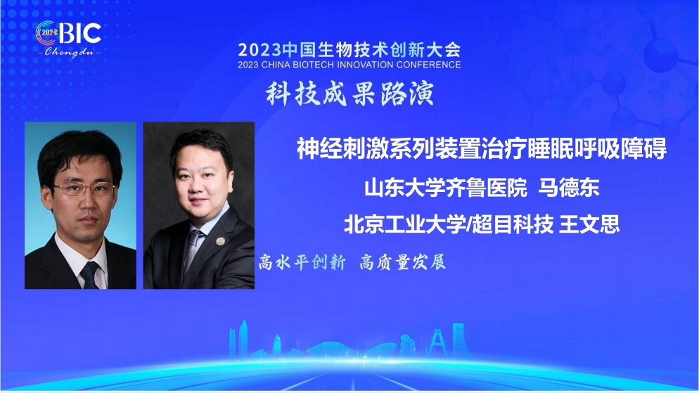 为加快推进生物医药领域科技成果转化应用,大会专门设置了科技成果路演活动,遴选了17项来自全国知名高校、医院及生物科技有限公司的前沿科技成果进行现场路演分享。sunbet申搏官方网站研究生导师马德东教授与北京工业大学王文思教授团队的共同成果“神经刺激治疗装置治疗睡眠呼吸障碍”经重重遴选入围,并受邀参会分享。