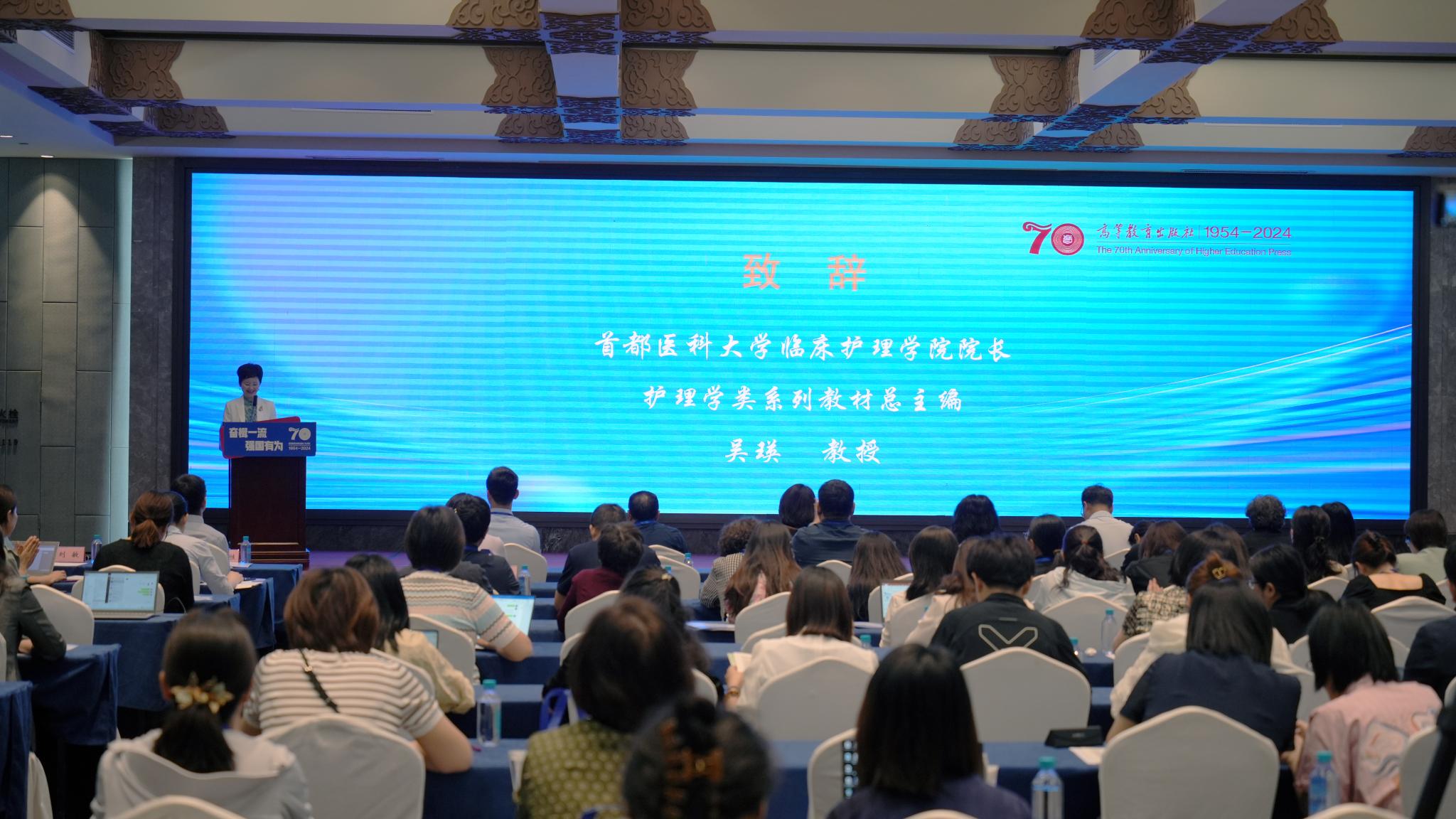 高等教育出版社农林医药与生命科学出版事业部周先海副主任及首都医科大学临床护理学院院长、护理学类系列教材总主编吴瑛教授为大会致辞,周先海副主任介绍了目前教材建设体制,他提到今年是高等教育出版社成立70周年,要不断夯实教材建设,打造更多一流课程、一流教材。吴瑛教授指出要紧跟新时代党和国家需求以及护理学科发展的需要,在教材编写中融入课程思政和护理临床思维,以开放的心态集思广益,积极推动教材建设与数字技术深度融合,共同书写护理教育的新篇章。