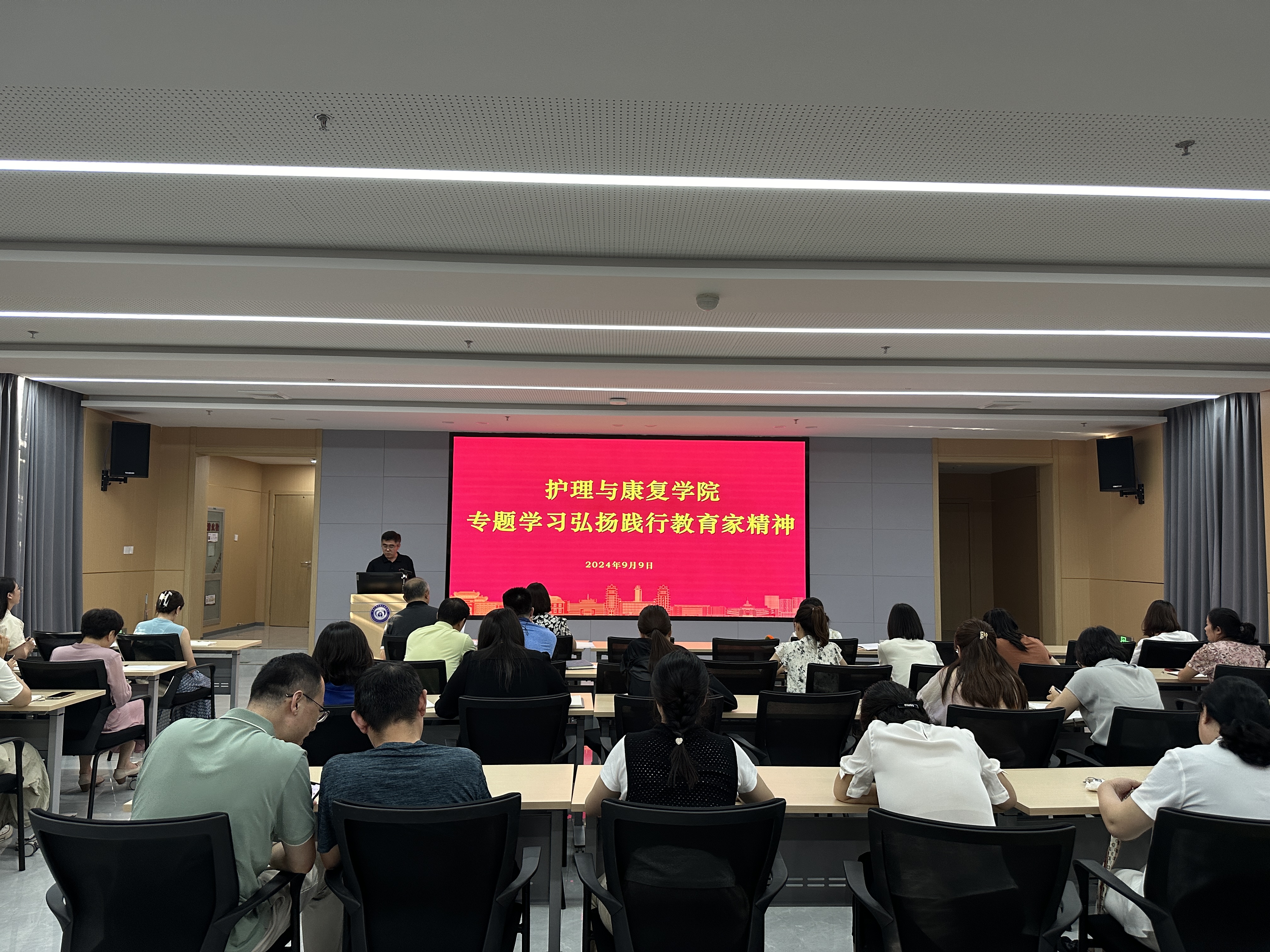 随后,学院党委副书记艾斌带领全体教职工集中学习弘扬践行教育家精神相关内容,勉励大家争做“有理想信念、有道德情操、有扎实学识、有仁爱之心”的“四有”好老师,大力弘扬践行教育家精神,为加快建设担当民族复兴大任的世界一流大学而团结奋斗。