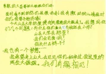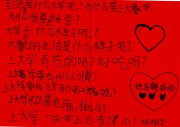 除此之外,小朋友还提出了很多问题,问得最多的就是大学是什么样子的。而这就是我们的任务啦。我们纷纷报名,参与到给山区小朋友回信的活动中去,用直白易懂又生动有趣的语言去回答他们的一个个问题,同时给予我们的祝福和祝愿。