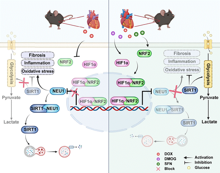 团队聚焦心肌细胞的代谢调控机制,通过研究发现,阿霉素破坏关键转录因子NRF2和HIF1α的相互作用,导致NEU1表达上调,进而通过溶酶体降解途径破坏SIRT1蛋白的稳定性,削弱其在心肌能量代谢中的保护功能,引发糖酵解紊乱和能量失衡,从而加重阿霉素诱导的心脏毒性。进一步研究表明,从基因干预到药物阻断,靶向调控NRF2/HIF1α/NEU1/SIRT1信号通路,不仅能够有效缓解阿霉素引起的代谢紊乱和心功能障碍,还在一定程度上增强了阿霉素的抗肿瘤效果。这一发现为临床上构建“心脏保护+抗癌增效”协同干预策略提供了新的思路,具有良好的临床转化前景。