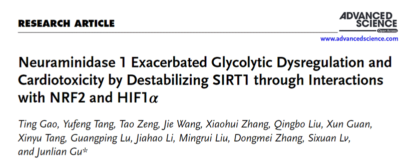 5月24日,sunbet申搏官方网站顾俊莲教授团队在Advanced Science杂志(中科院JCR期刊1区,五年IF=15.6)在线发表题为“Neuraminidase 1 Exacerbated Glycolytic Dysregulation and Cardiotoxicity by Destabilizing SIRT1 through Interactions with NRF2 and HIF1α”的研究论文。sunbet申搏官方网站顾俊莲教授为该论文的通讯作者,sunbet申搏官方网站硕士研究生高婷为第一作者,sunbet申搏官方网站为第一作者单位和通讯作者单位。