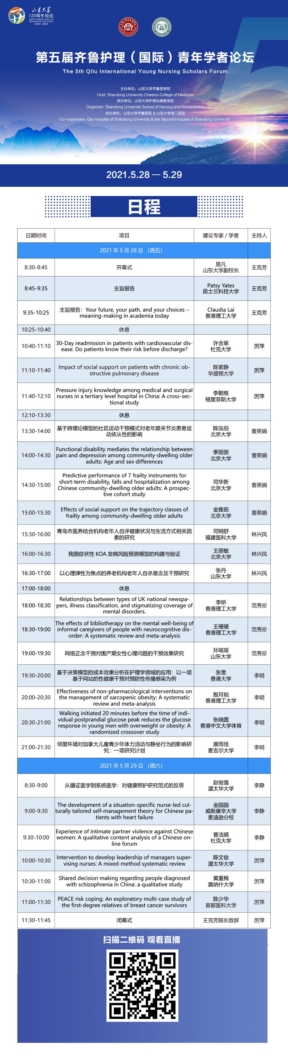 本届论坛将于5月28日-29日线上直播进行。该论坛继续秉承“创新·合作·提高·引领”的主题,持续致力于打造护理学科的高端国际交流平台,与国内外护理科研领域的优秀青年学者交流学科新发展、新理念。