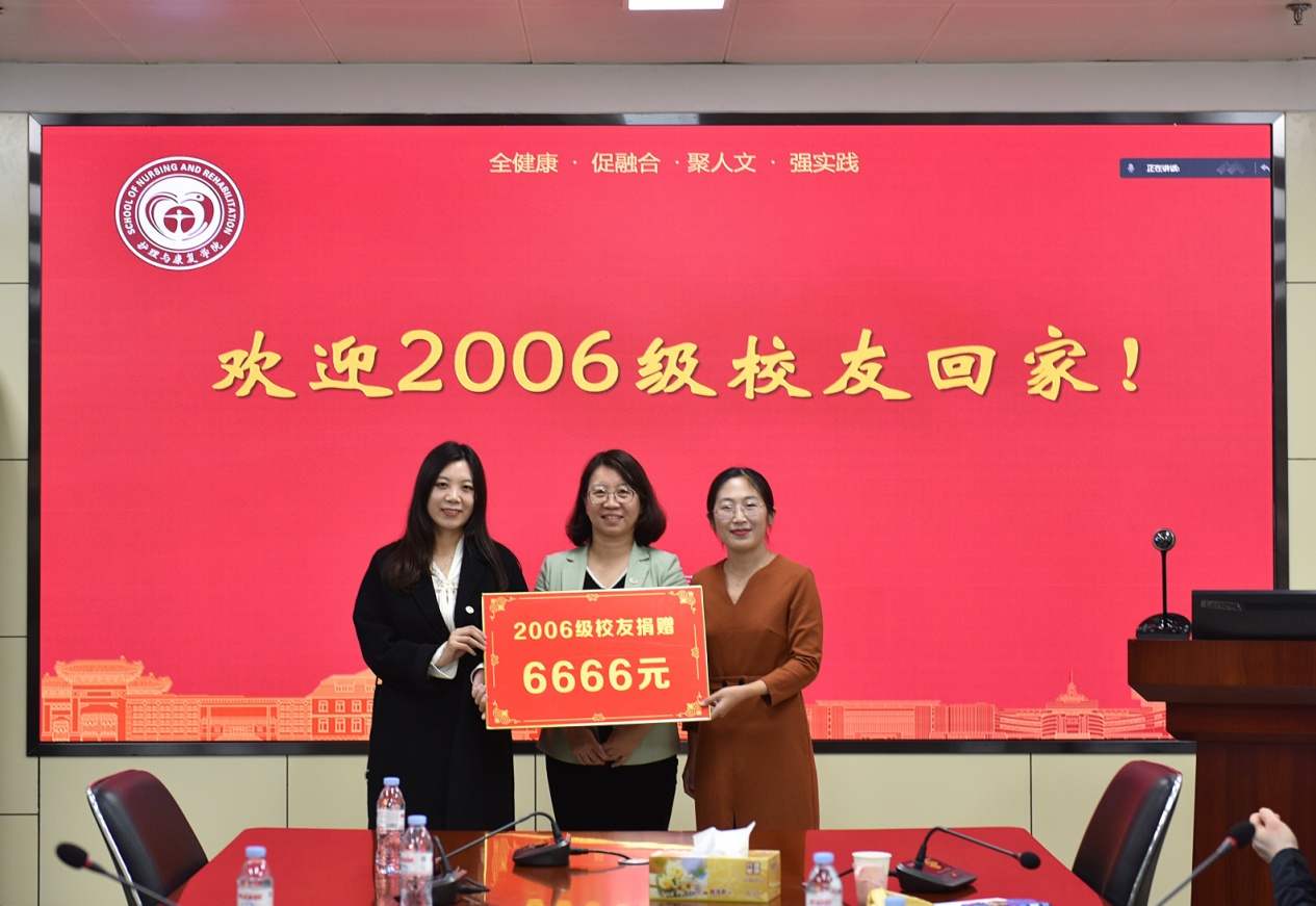 座谈会结束前,2006级同学向“sunbet申搏官方网站护理教育基金”捐款6666元,支持学院护理教育事业发展,王克芳院长代表学院接受了捐款。(图:李承霖)