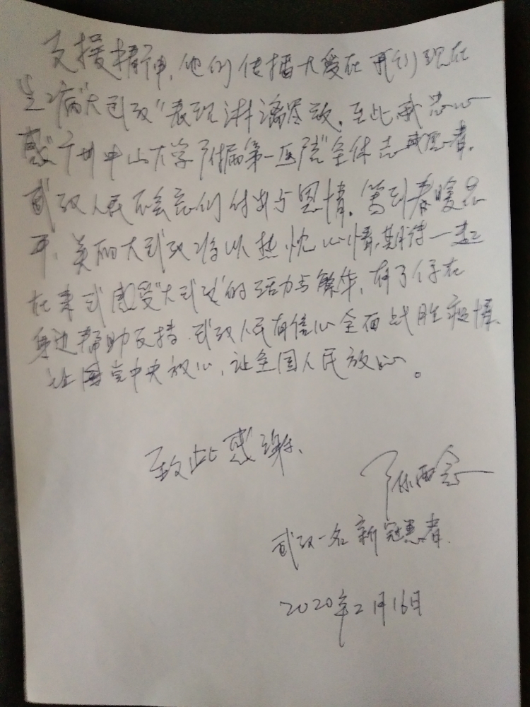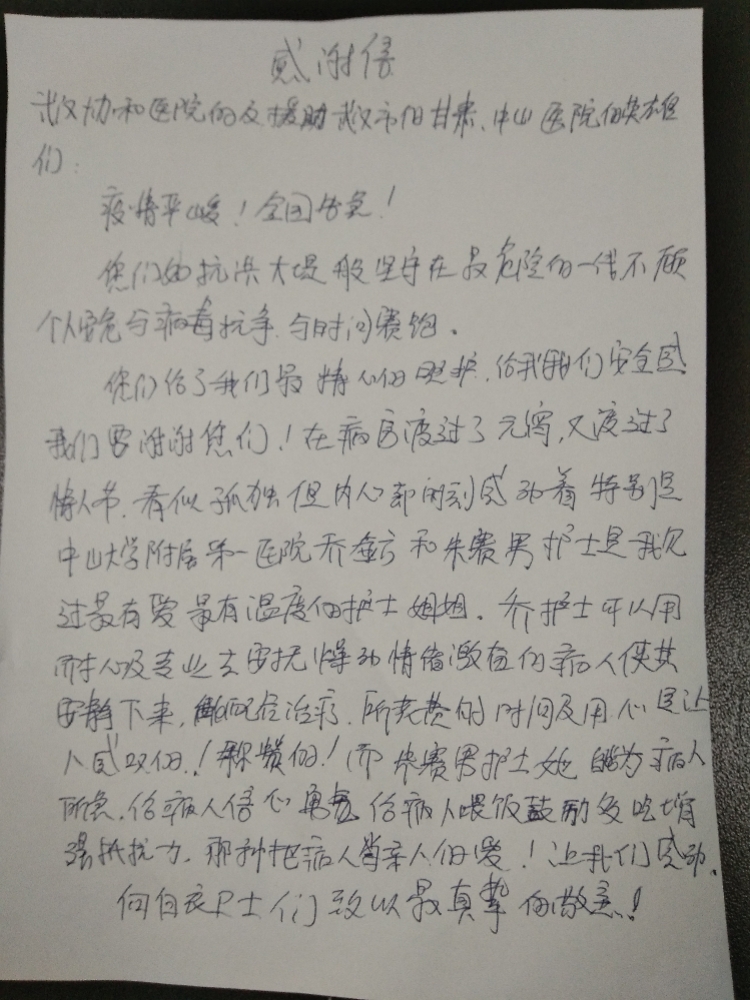 42床患者在信中说:“你们如抗洪大堤般坚守在最危险的一线,不顾个人安危与病毒抗争,与时间赛跑。你们给了我们最精心的照护,给我们安全感!我们要谢谢您们!在病房度过了元宵,又度过了情人节,看似孤独但内心却时刻感动着,特别是中山大学附属第一医院乔金方和朱赛男护士是我见过最有爱最有温度的护士姐姐……
