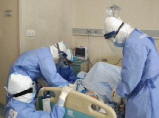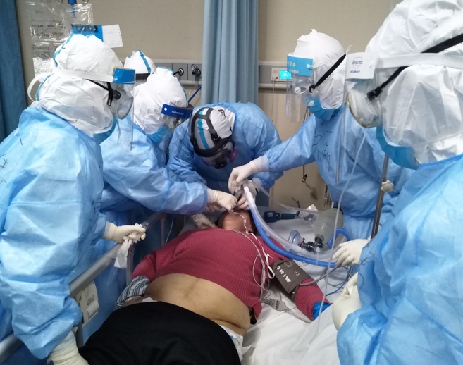 患者病情突发变化,须行气管插管。病情就是命令!中山大学附属第一医院援鄂医疗队驻协和西院六楼东病区第五小组的队员默契地团队配合,转移患者至重病房、备药、备呼吸机、气管插管一气呵成,保住了患者的生命。